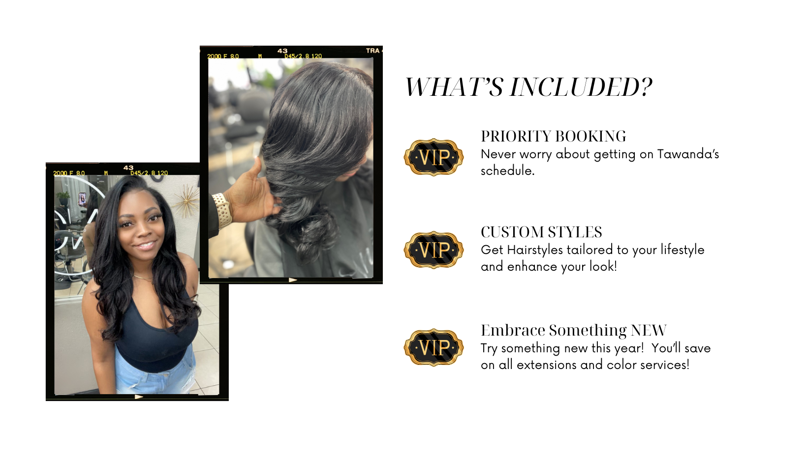 With this personalized experience, you’ll always look your best. Tawanda’s VIP clients get: